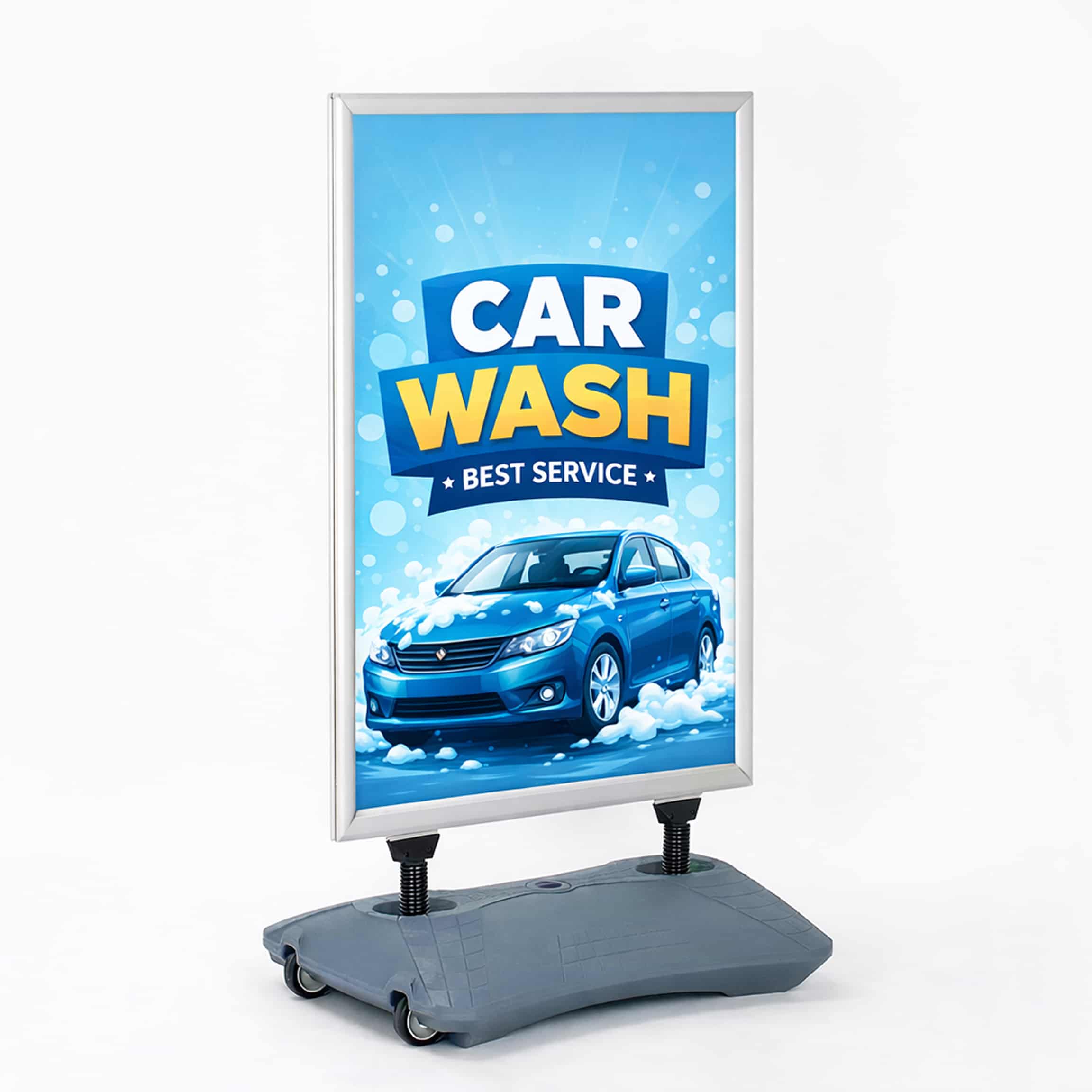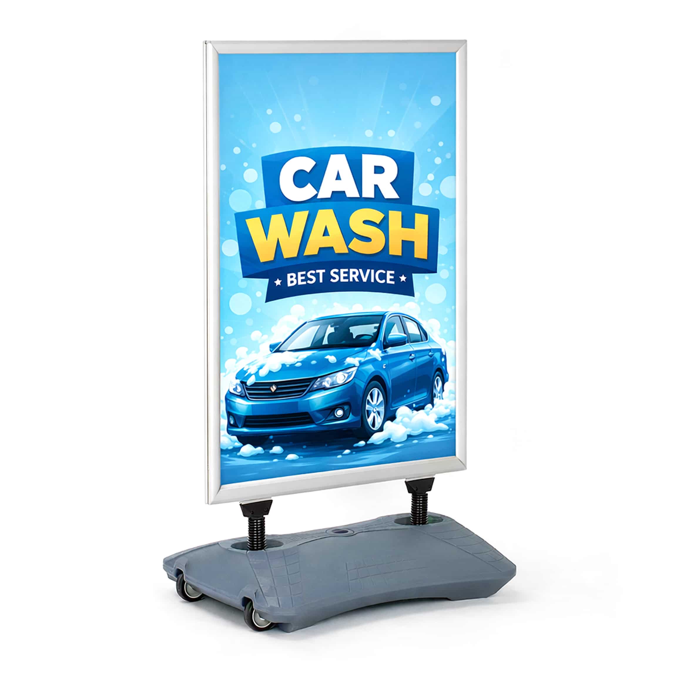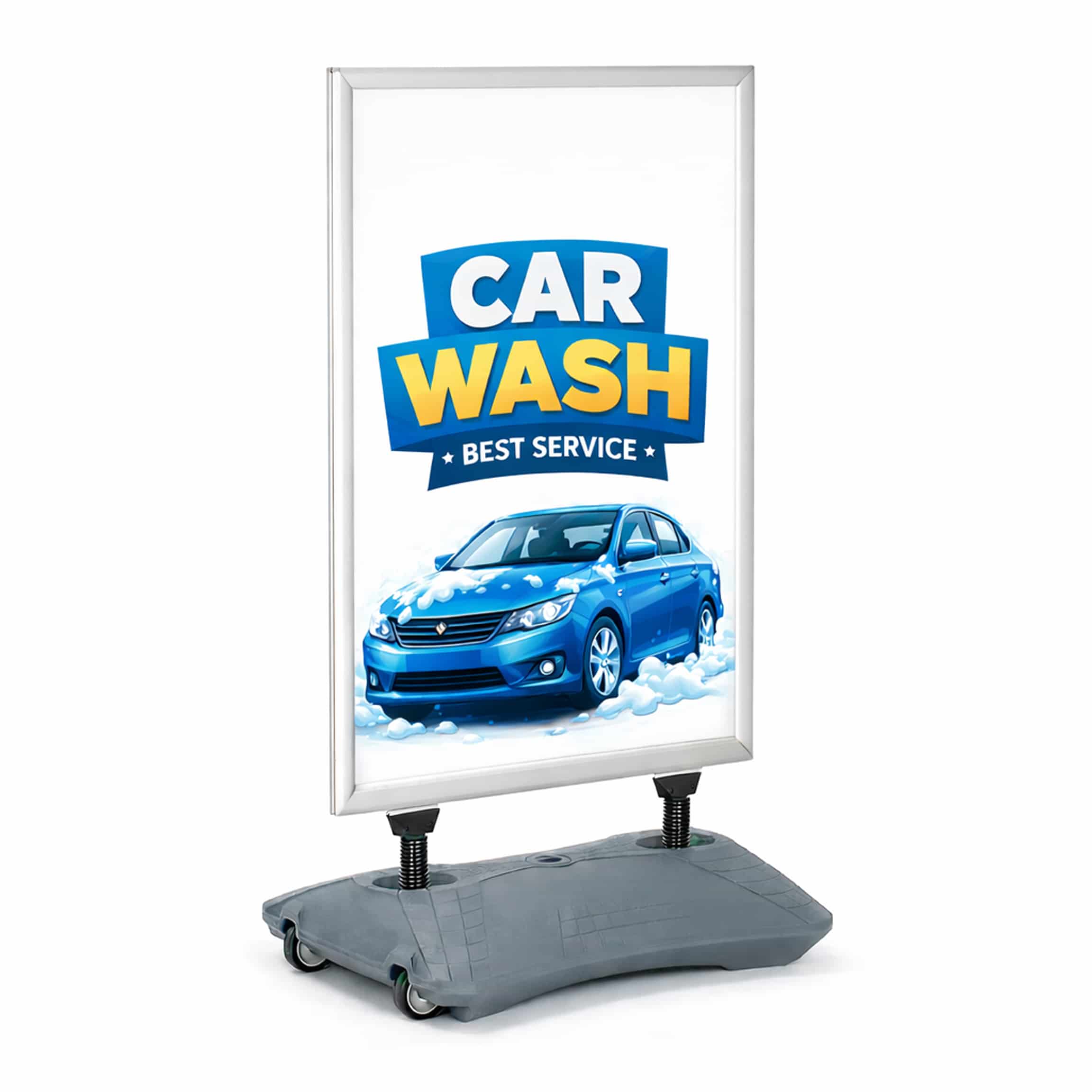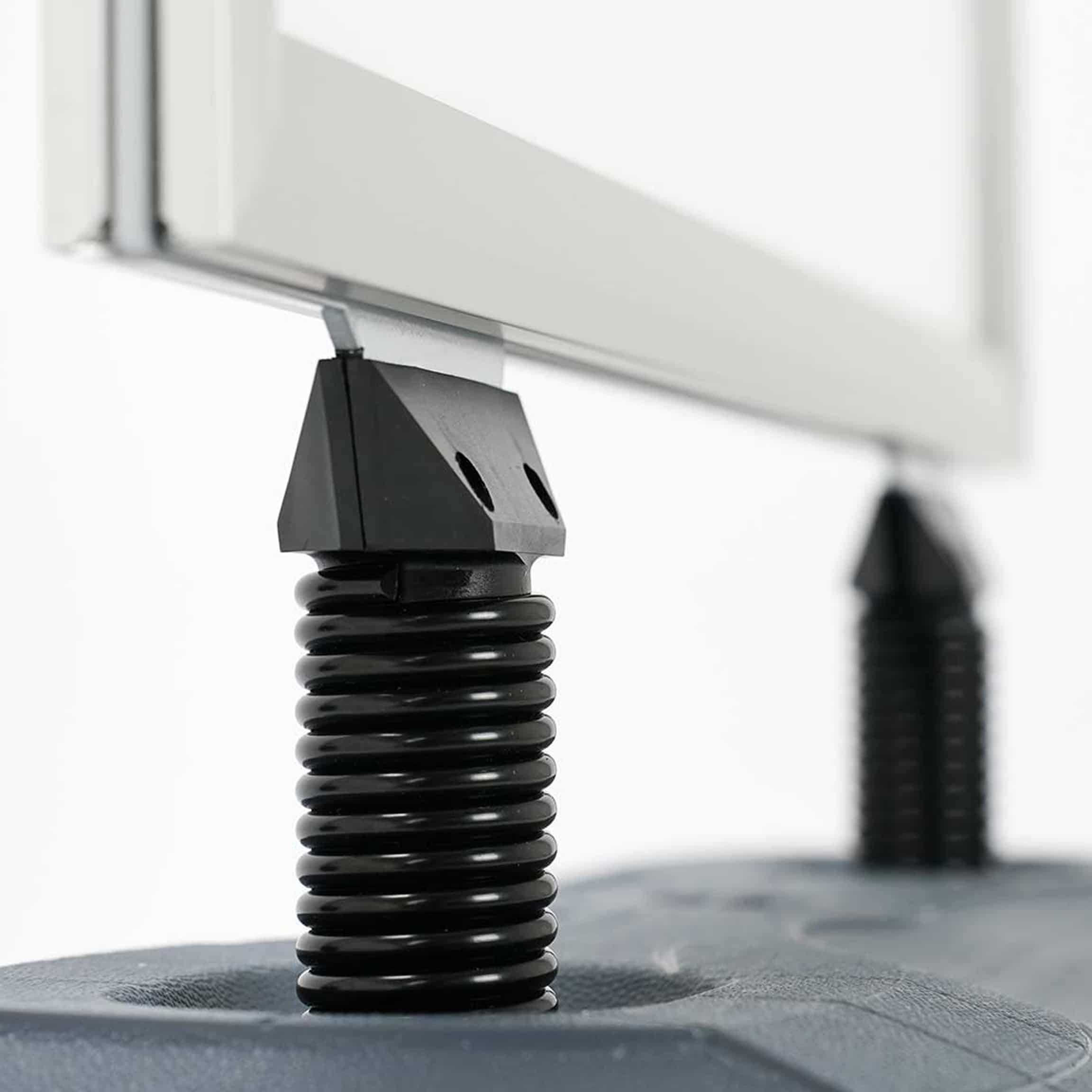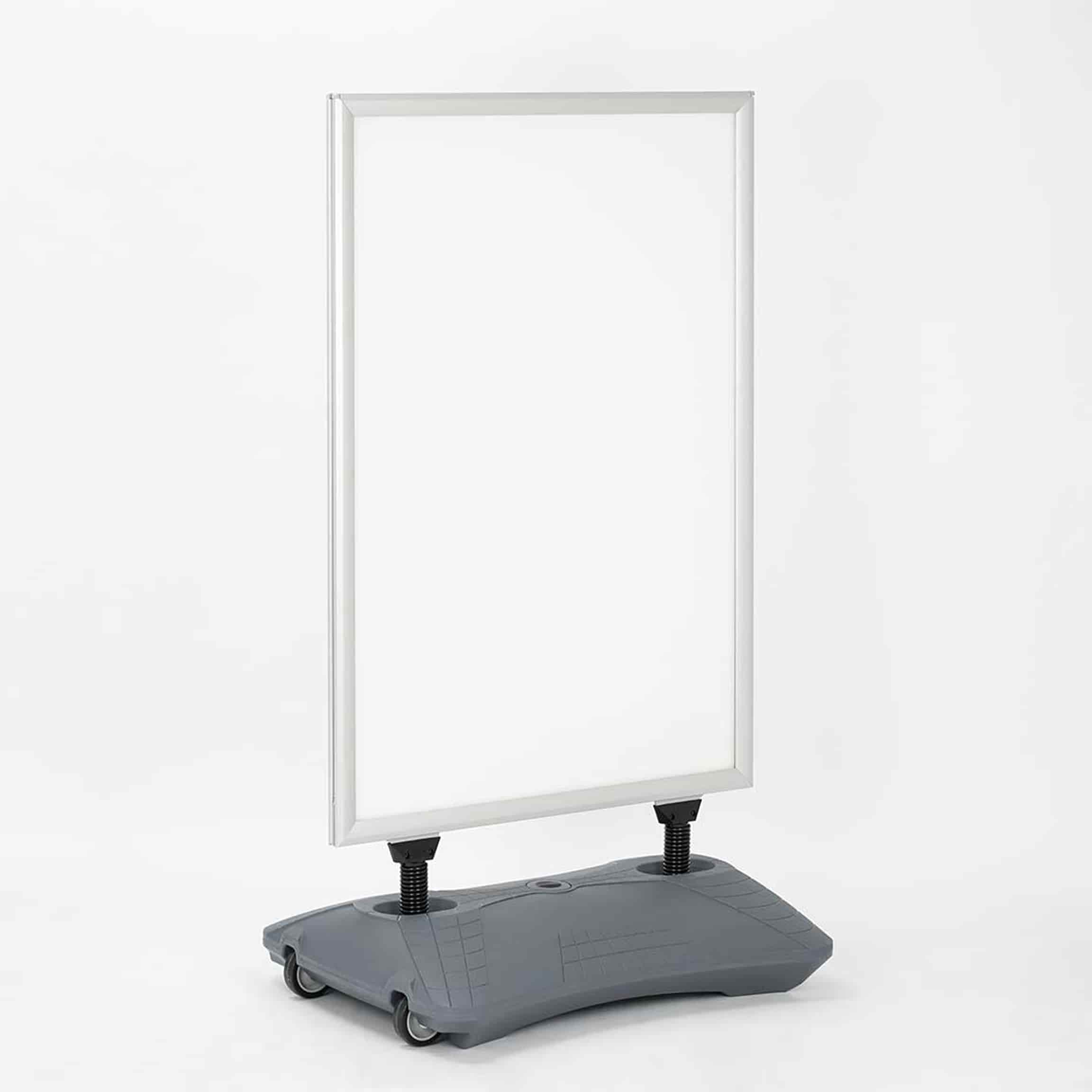cavalletto pubblicitario con cornice a scatto 70×100 cm h. Il cavalletto è costituito da una base zavorrabile riempibile di acqua. Le molle laterali contribuisco alla stabilità del cavalletto in caso di vento.