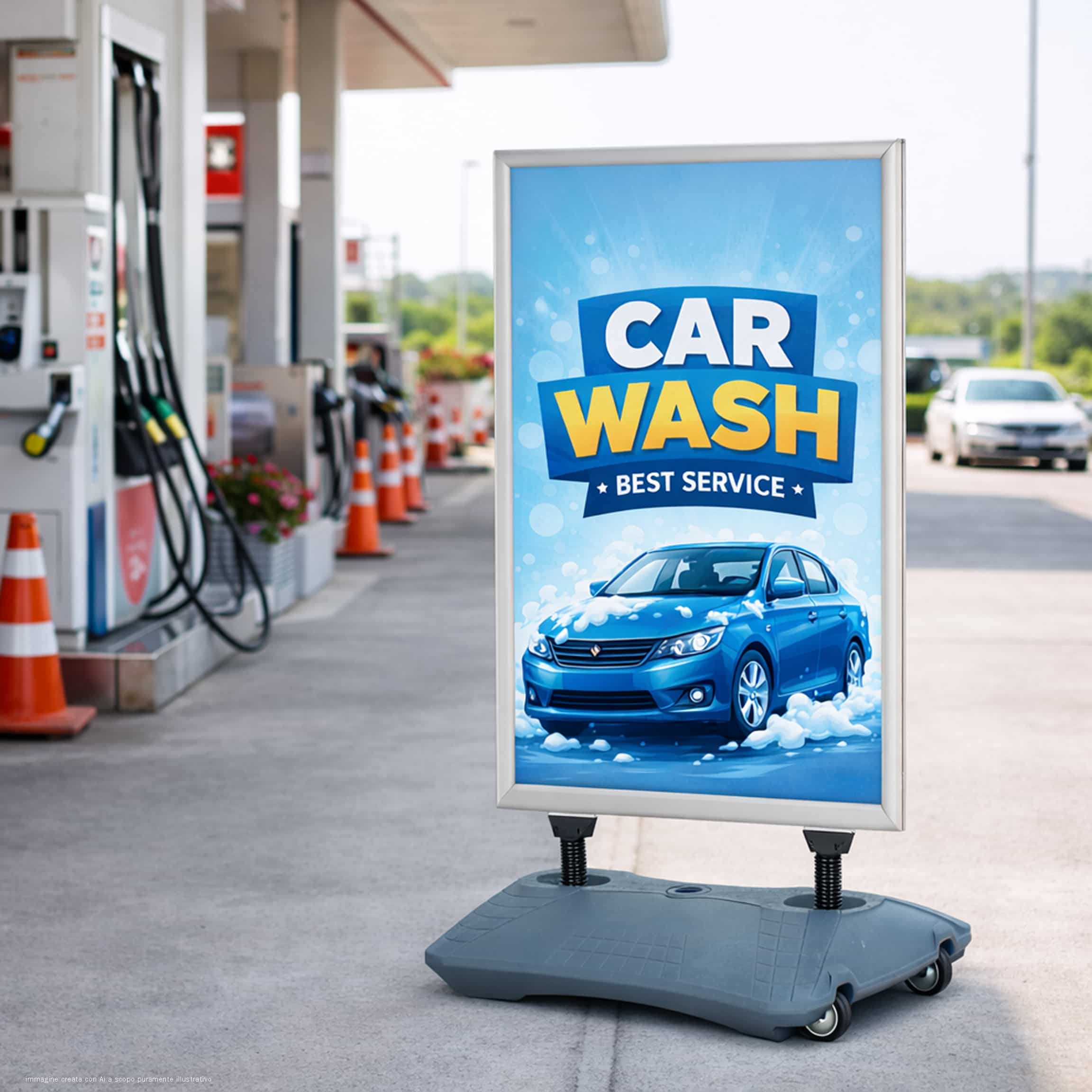 Il cavalletto può essere utilizzato in prossimità di negozi, ristoranti, bar e stazioni di servizio. Puoi inserire qualsiasi messaggio pubblicitario.