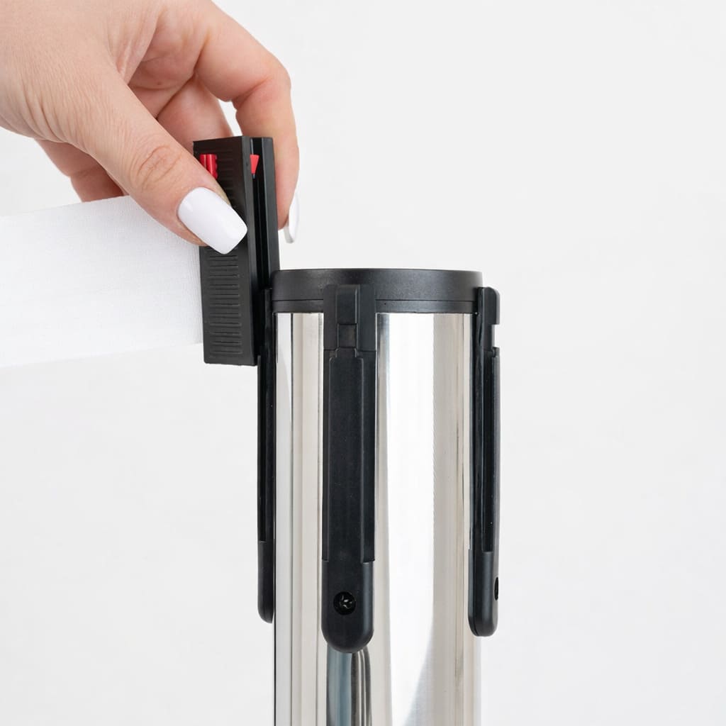 Sistema retrattile – movimento di ritorno il nastro si arrotola su se stesso per scomparire completamente all’interno della colonna quando non è necessario utilizzarlo.