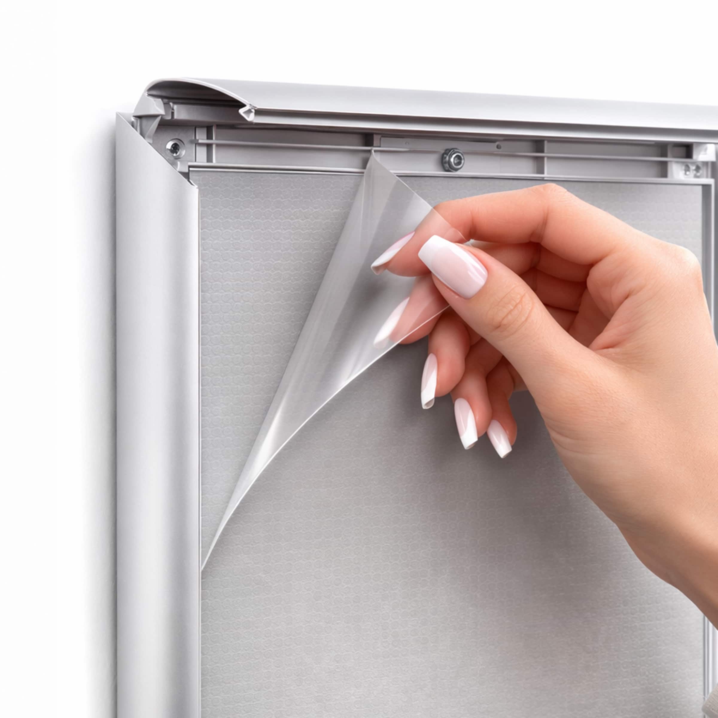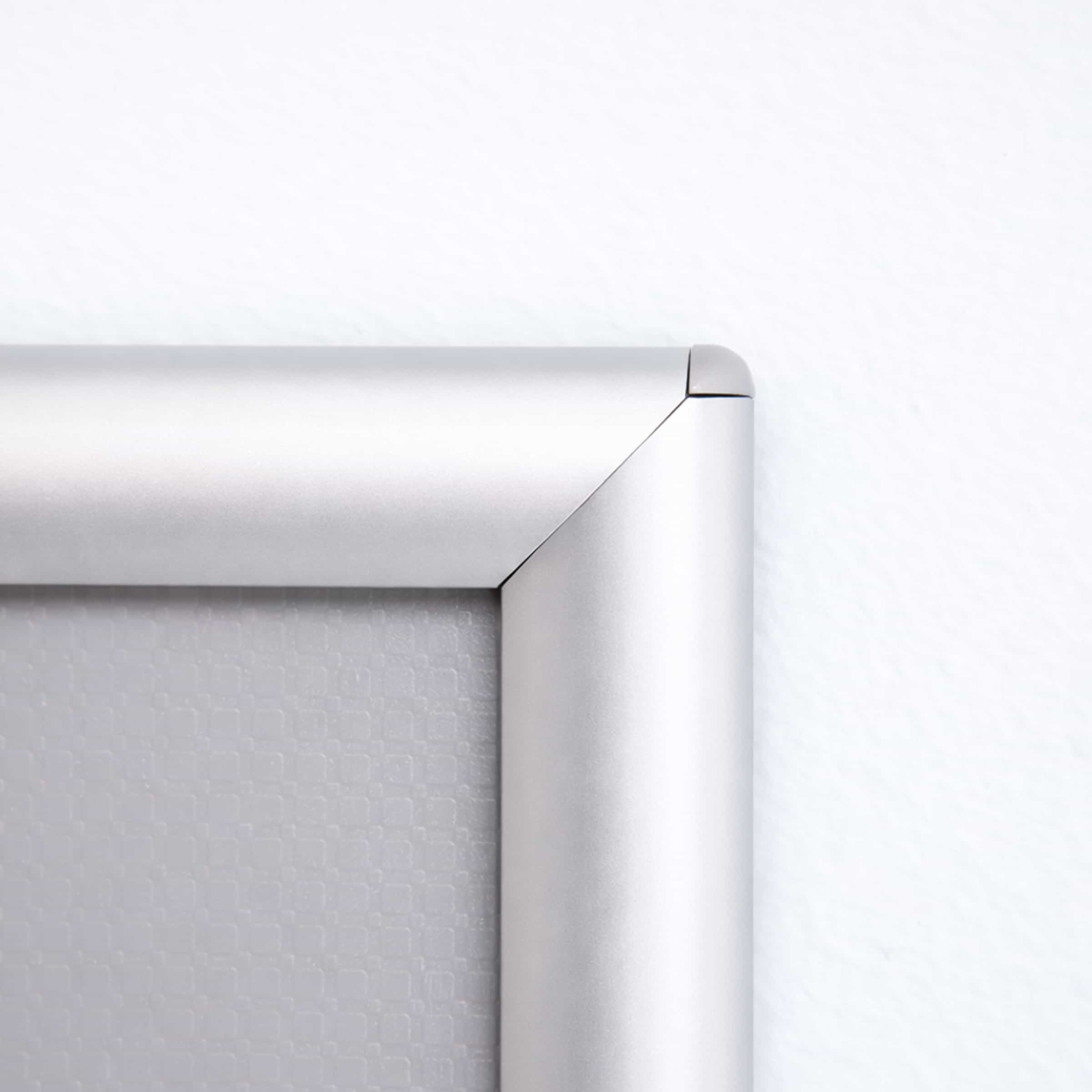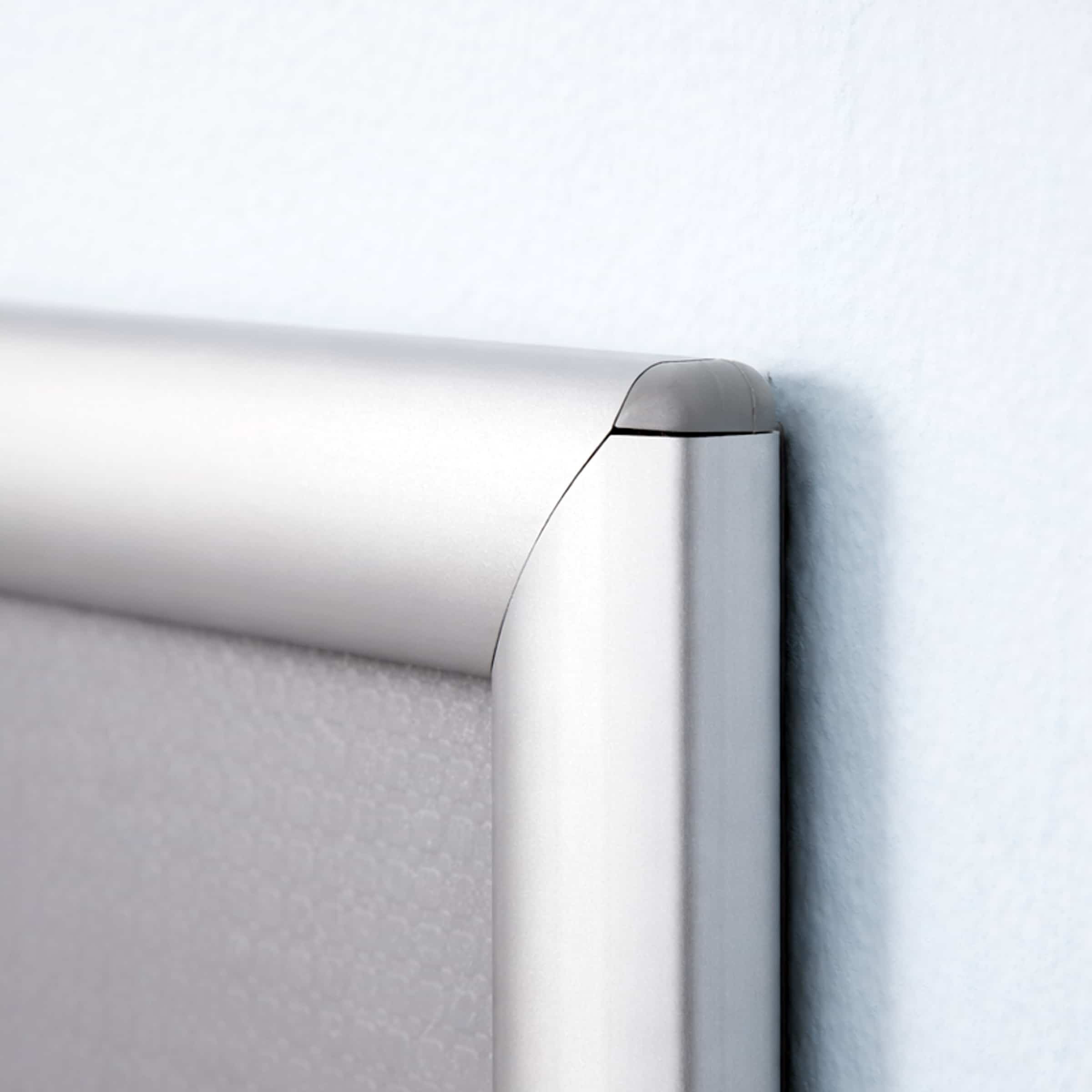 La cornice a scatto con angoli arrotondati e smussati è progettata per offrire un sistema pratico, veloce e professionale per la sostituzione di poster, locandine e materiali pubblicitari. Grazie al meccanismo a scatto , è possibile aprire e chiudere il profilo con un semplice movimento, consentendo il cambio rapido della grafica senza dover rimuovere la cornice dalla parete.