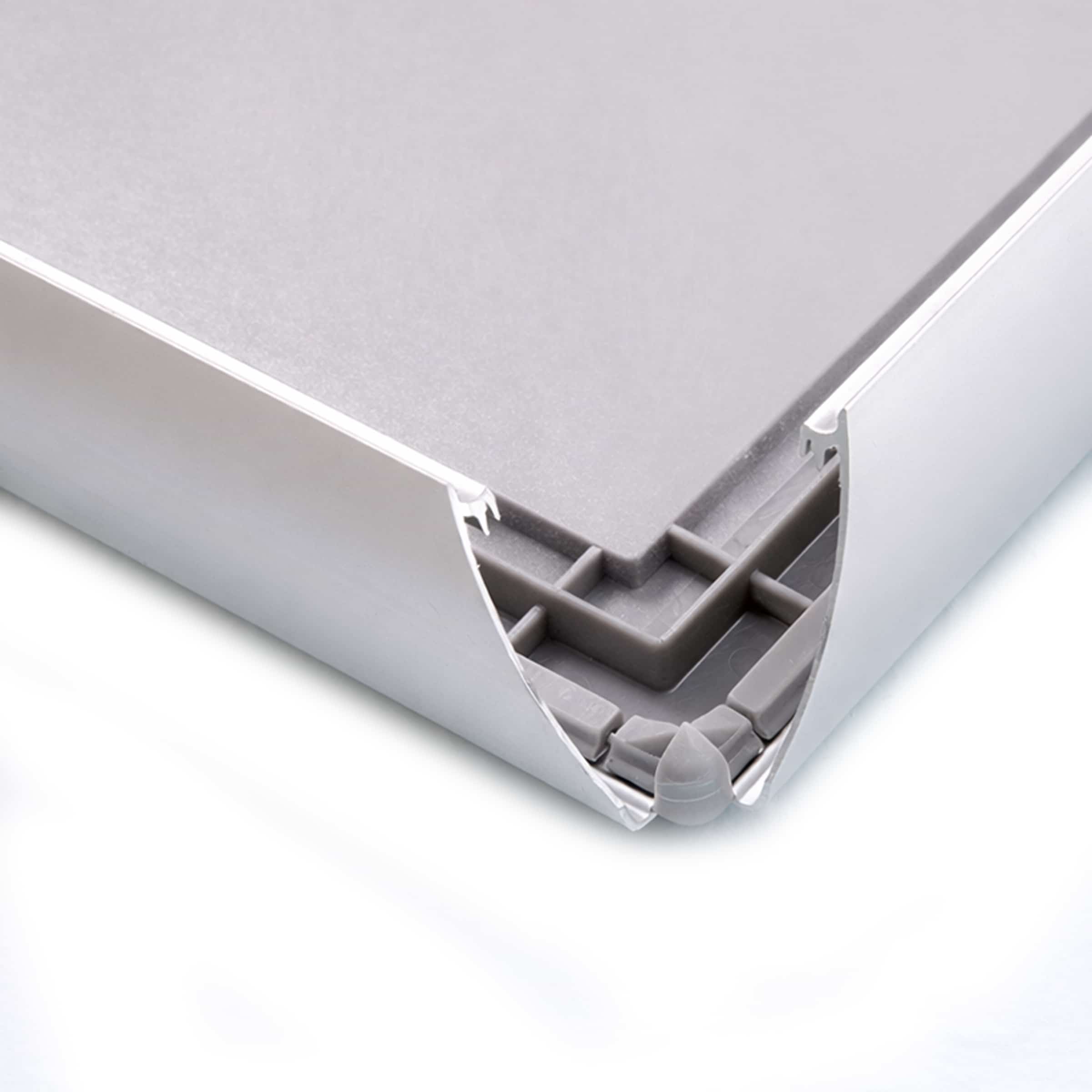 Profilo di alluminio 25 mm con angolo a vertice smussato. Foglio di protezione antiriflesso per la protezione della grafica.