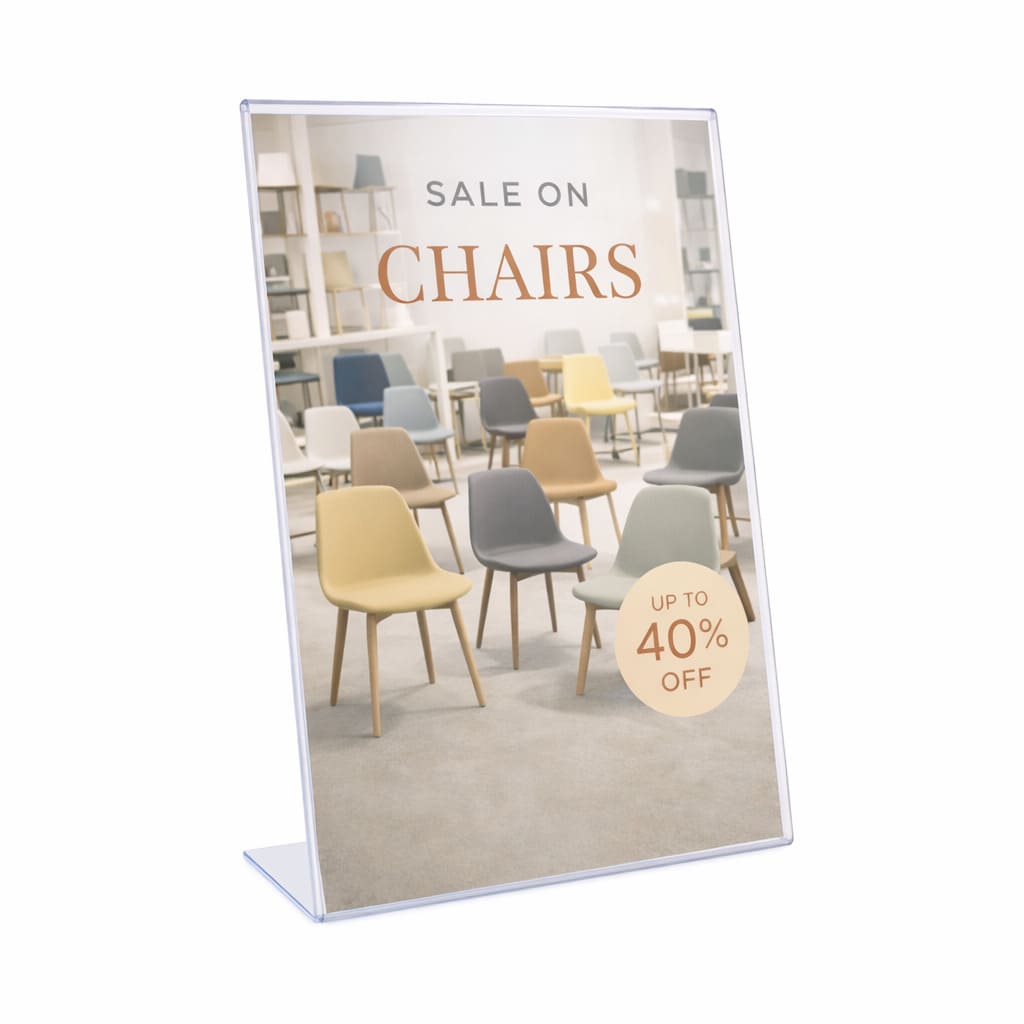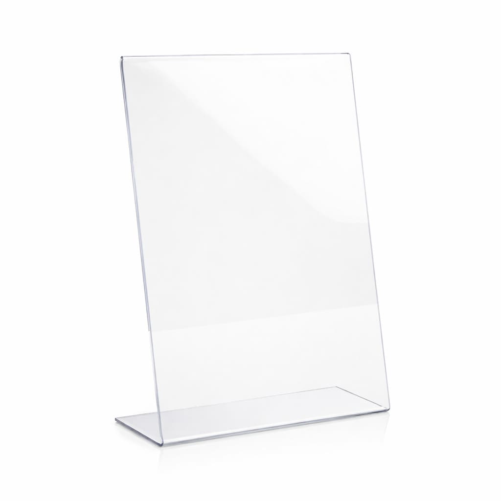 Porta avvisi da banco in acrilico trasparente, porta informazioni, monofacciali con base ad L. Porta avvisi trasparenti per esporre avvisi, prezzi, o altre informazioni all’interno dei negozi, supermercati, fiere o eventi.