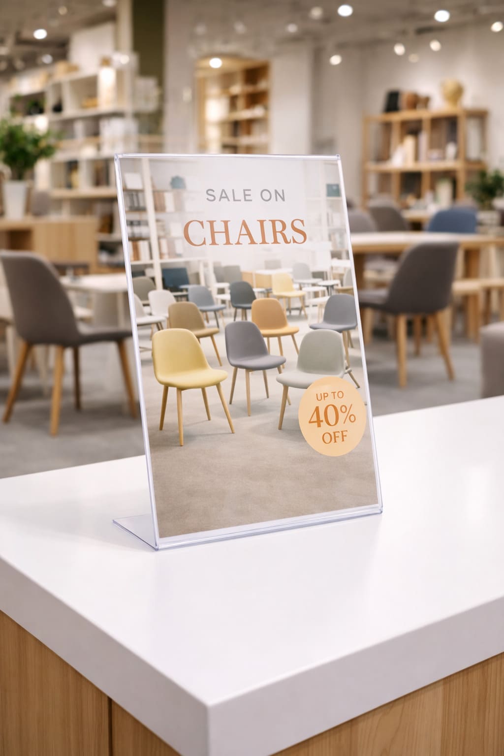 Perfetti anche come porta prezzi per negozi e punti vendita, permettono di valorizzare prodotti e offerte in modo chiaro ed elegante. Grazie al loro design pratico, si adattano facilmente a qualsiasi ambiente interno, risultando una soluzione efficace per la comunicazione promozionale, la segnaletica informativa e l’esposizione di materiali pubblicitari.