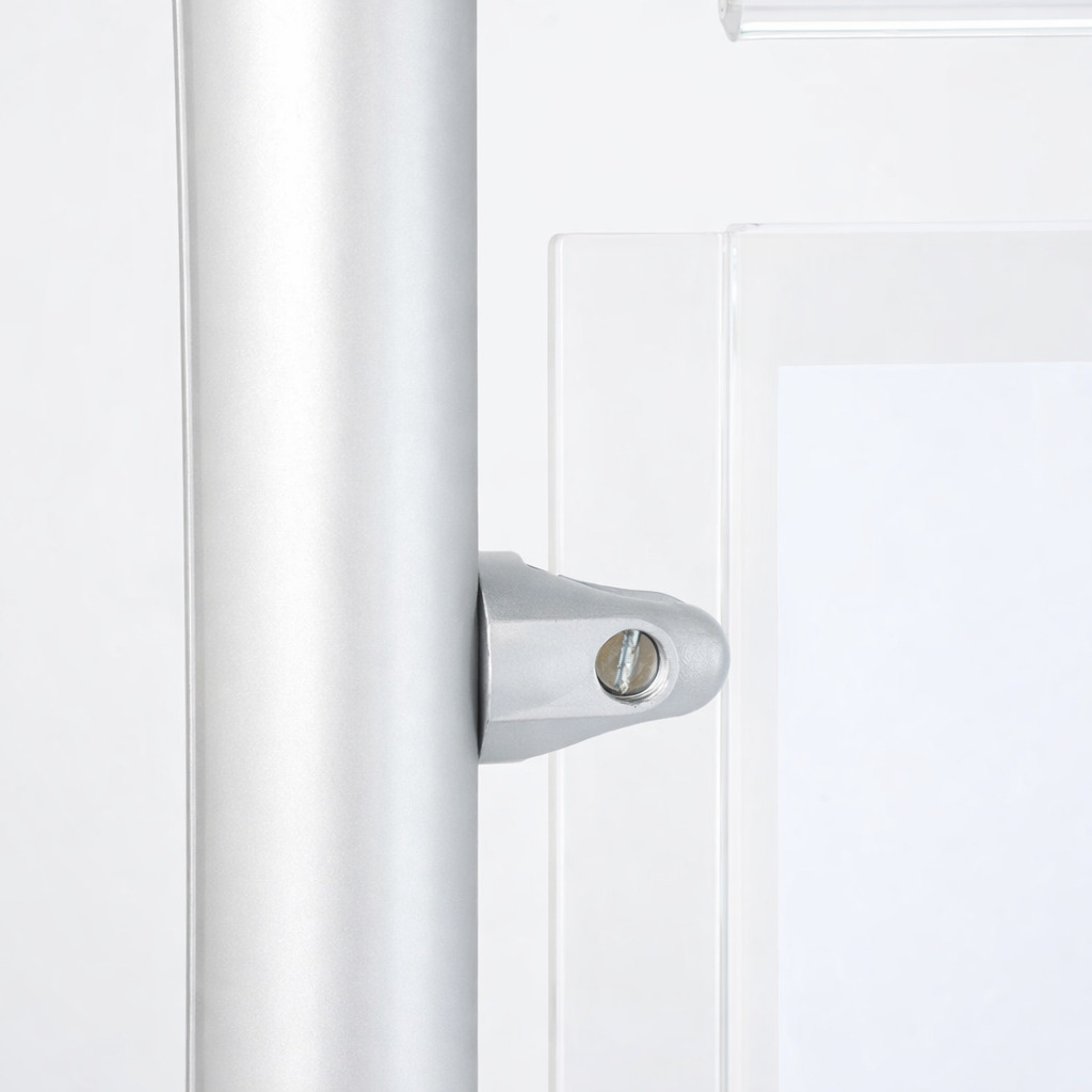 Le tasche sono multiple e sovrapposte su vari livelli, ed hanno uno spessore 3 mm. Sono collegate da profili traversi in alluminio anodizzato diametro 30 mm tramite attacchi a bandiera satinati silver. Piedini in metallo verniciato a polveri silver. La grafica può essere inserita facilmente ed è visibile monofacciale e bifacciale.