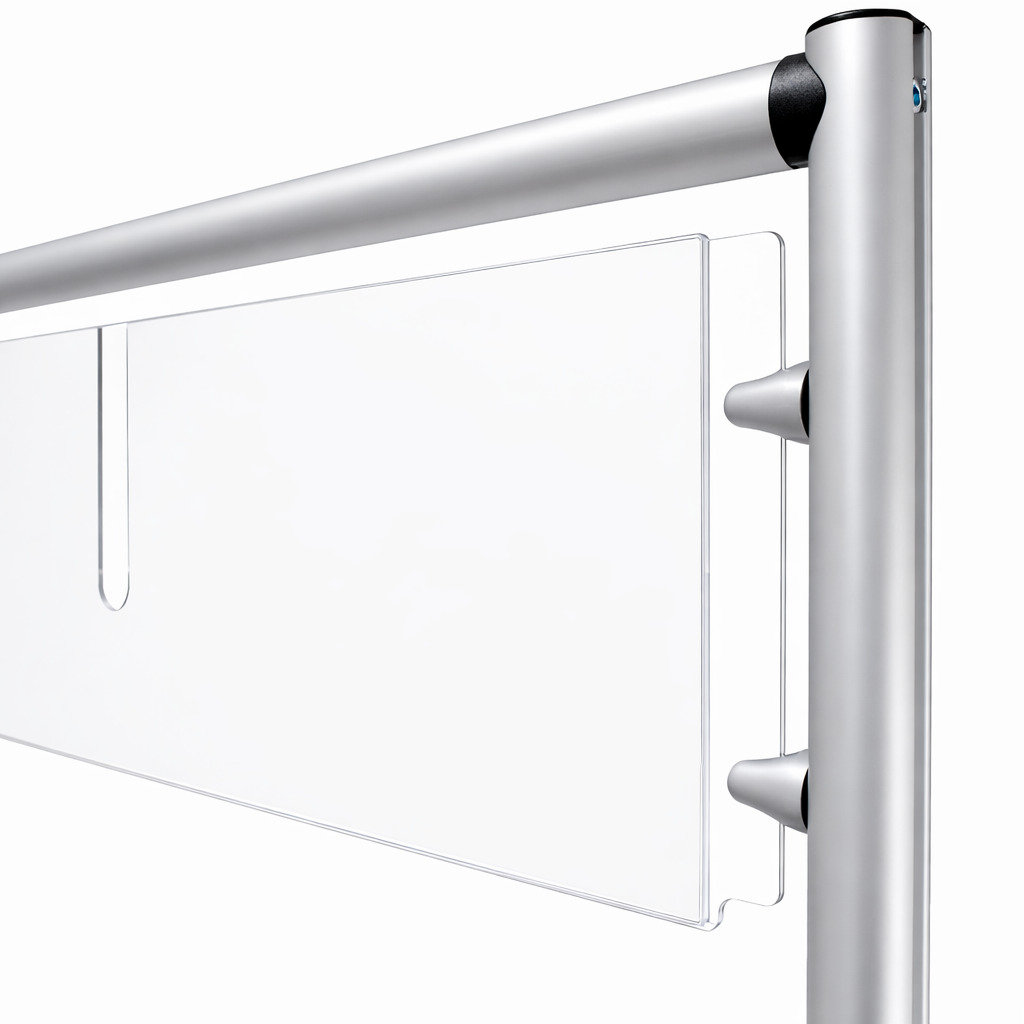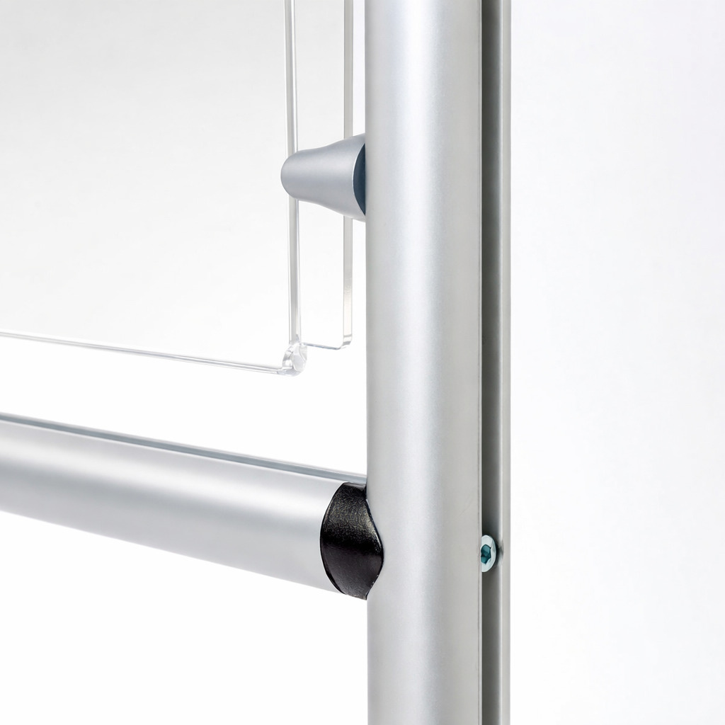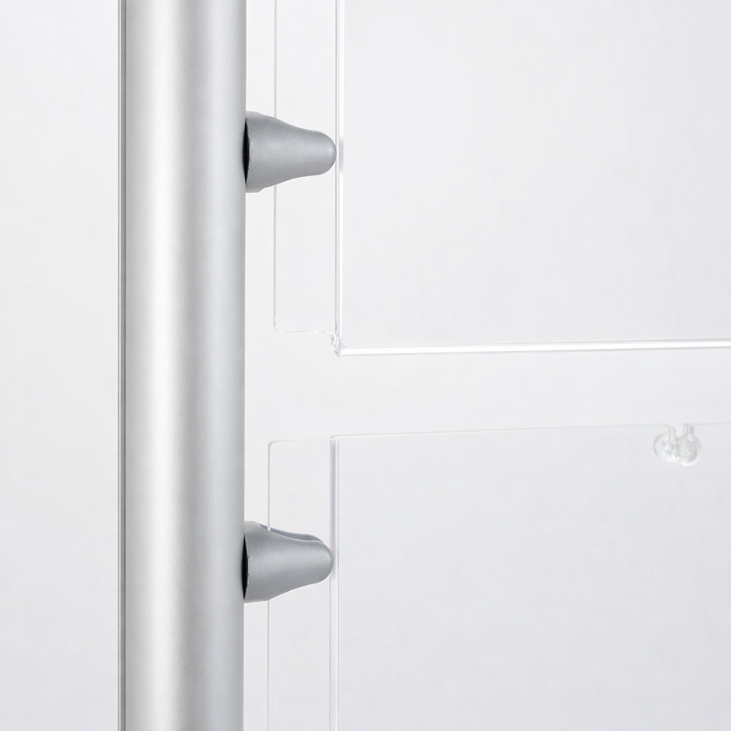 Espositore pubblicitario con tasche multiple. L’espositore porta avvisi è formato da una struttura in alluminio anodizzato con montanti in alluminio anodizzato silver a sezione ovale finitura silver, e da tasche in plexiglass trasparente per l’esposizione di avvisi, comunicazioni, informazioni di qualsiasi genere.