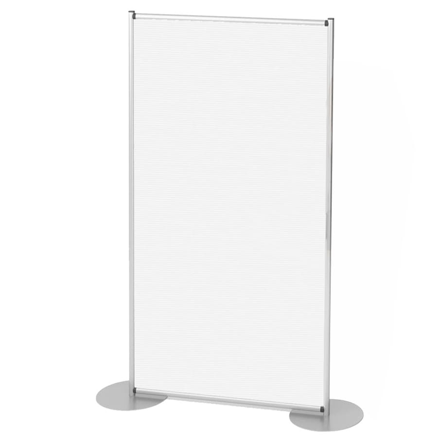 Struttura con profili di alluminio diametro 30 mm, due basi portanti, e pannello. La parete divisoria può essere collocata e spostata facilmente all'interno di qualsiasi ambiente interno per creare partizioni di ambienti, separè, e partizioni temporanee di ambienti.