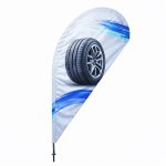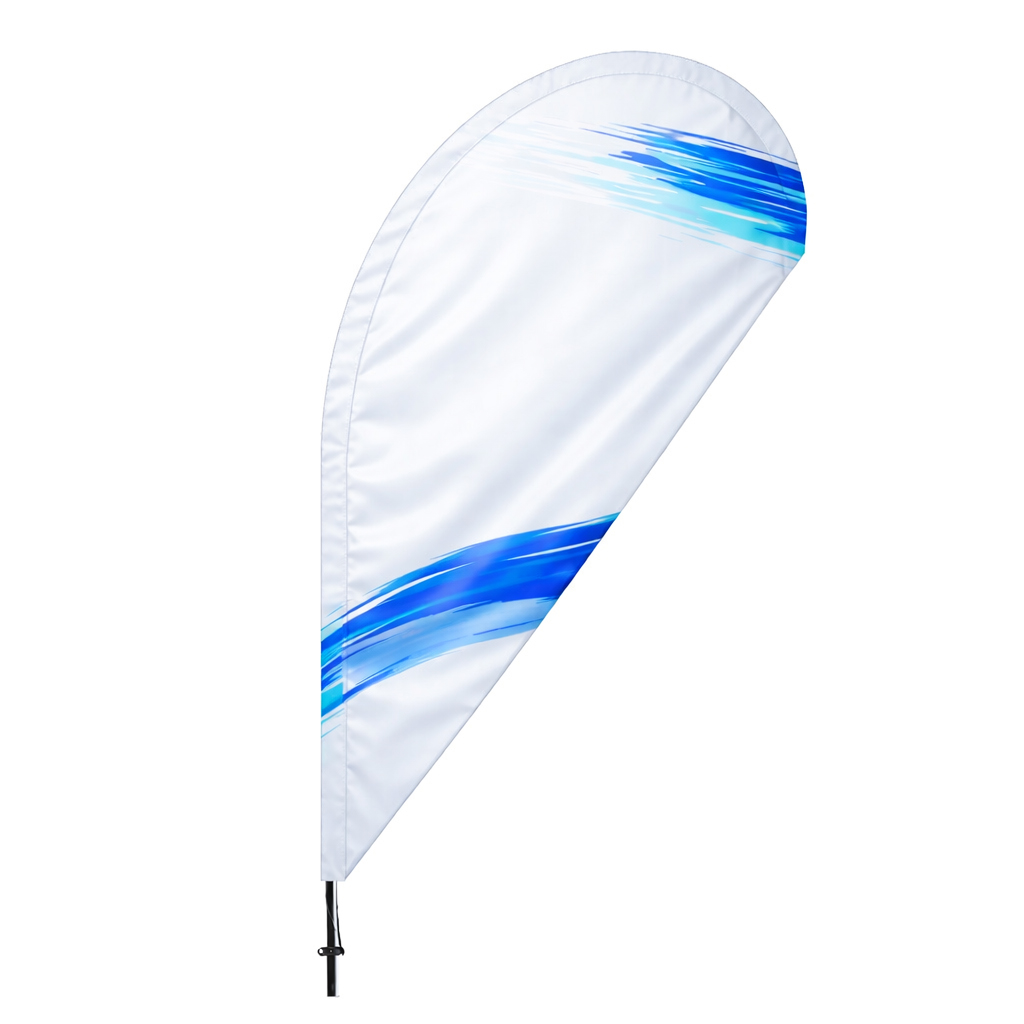 - Design e forma: Le bandiere sono realizzate in tessuto nautico e resistente che viene allestito verticalmente nell’asola dell’asta di fibra di vetro. La forma a goccia consente loro di muoversi con il vento, attirando l’attenzione delle persone. Possono essere disponibili in diverse dimensioni, S, M, L, XL