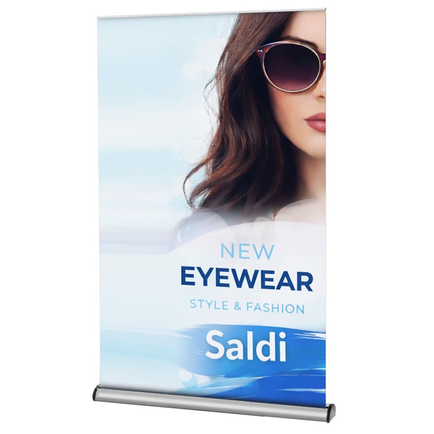 Un espositore promozionale facile da allestire. La stampa è avvolgibile all'interno della base e può essere sostituita con altro soggetto grafico.