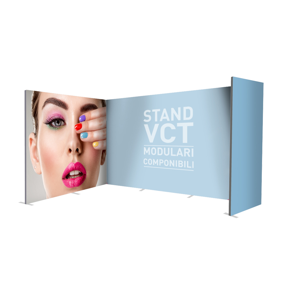 In un secondo momento puoi aggiungere altri moduli VCT per creare in futuro altre configurazioni. Se in un secondo tempo devi allestire uno spazio fieristico più grande puoi sempre acquistare altri moduli, predisposti per essere uniti tra loro sia in modo ortogonale (a 90°) sia in modo lineare per creare pareti di grande formato.