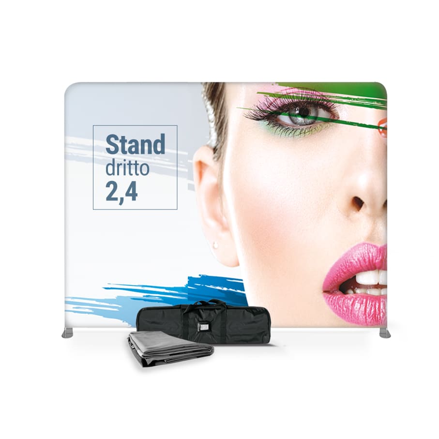 Stand portatile dritto 2,4 metri per fiere de eventi, con stampa bifacciale in tessuto antipiega. Puoi scegliere la stampa standard con tessuto Stretch, oppure su tessuto UShade tessuto elastico antipiega antiluce ideale per stand fieristici ed eventi. Prodotto inclusa borsa da trasporto.