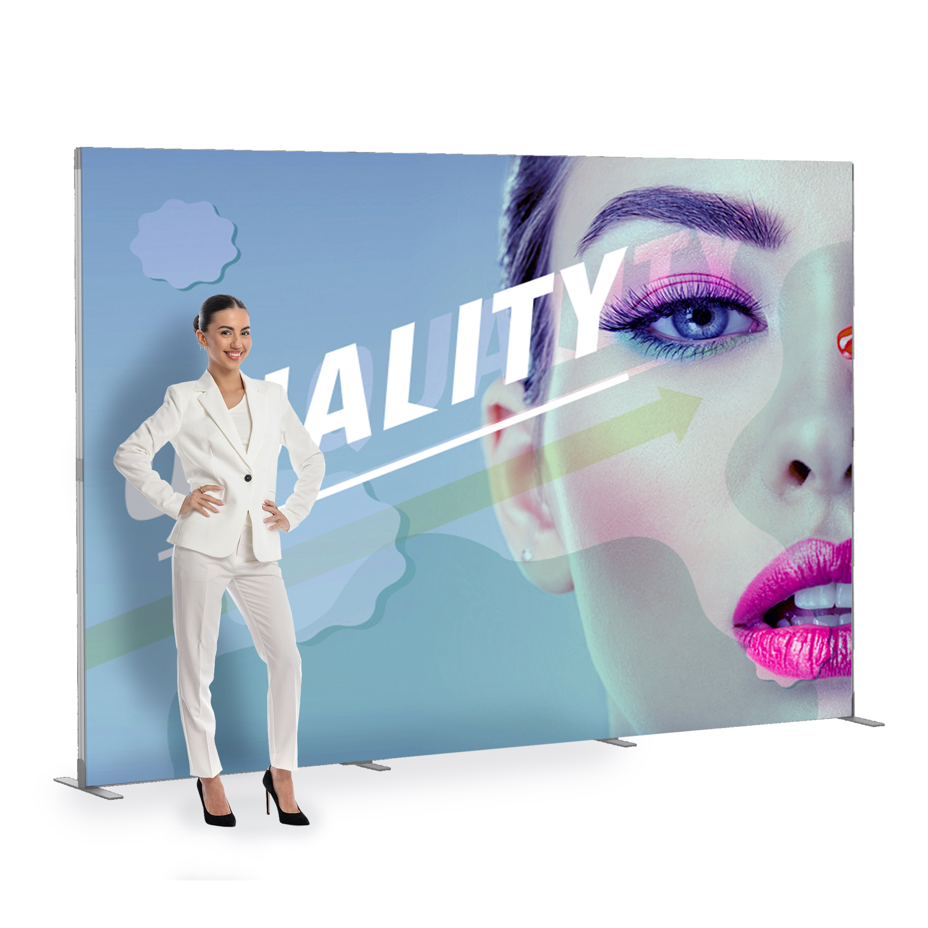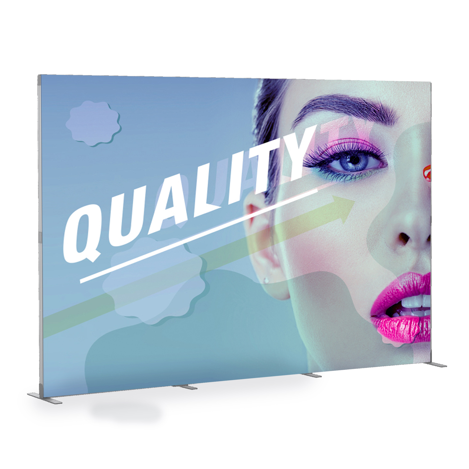 Fondale autoportnate con profilo di alluminio FRAME. Leggero e compatto si monta in pochi istanti senza attrezzi. Perfetto per creare in pochissimo tempo isole promozionali, corner pubblicitari, e stand fieristici. Incluso di basi portanti e borsa da trasporto.
